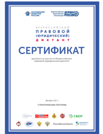 Участники Всероссийского правового(юридического)диктанта получат сертификат с личным результатом.